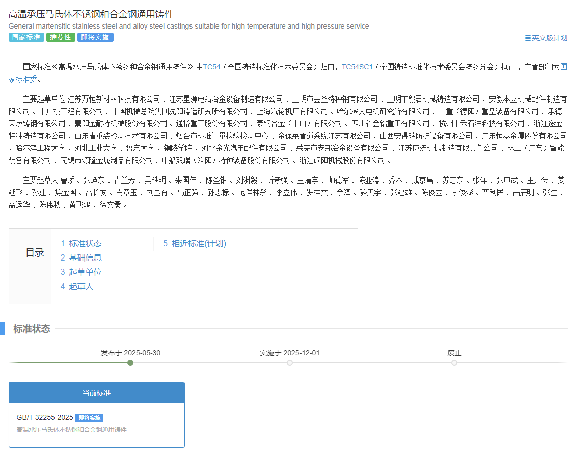 由江蘇萬恒新材料科技有限公司 、江蘇星源電站冶金設(shè)備制造有限公司等主要單位起草的國家標(biāo)準(zhǔn)《高溫承壓馬氏體不銹鋼和合金鋼通用鑄件》于2025年5月30日發(fā)布,將于2025年12月1日實(shí)施。