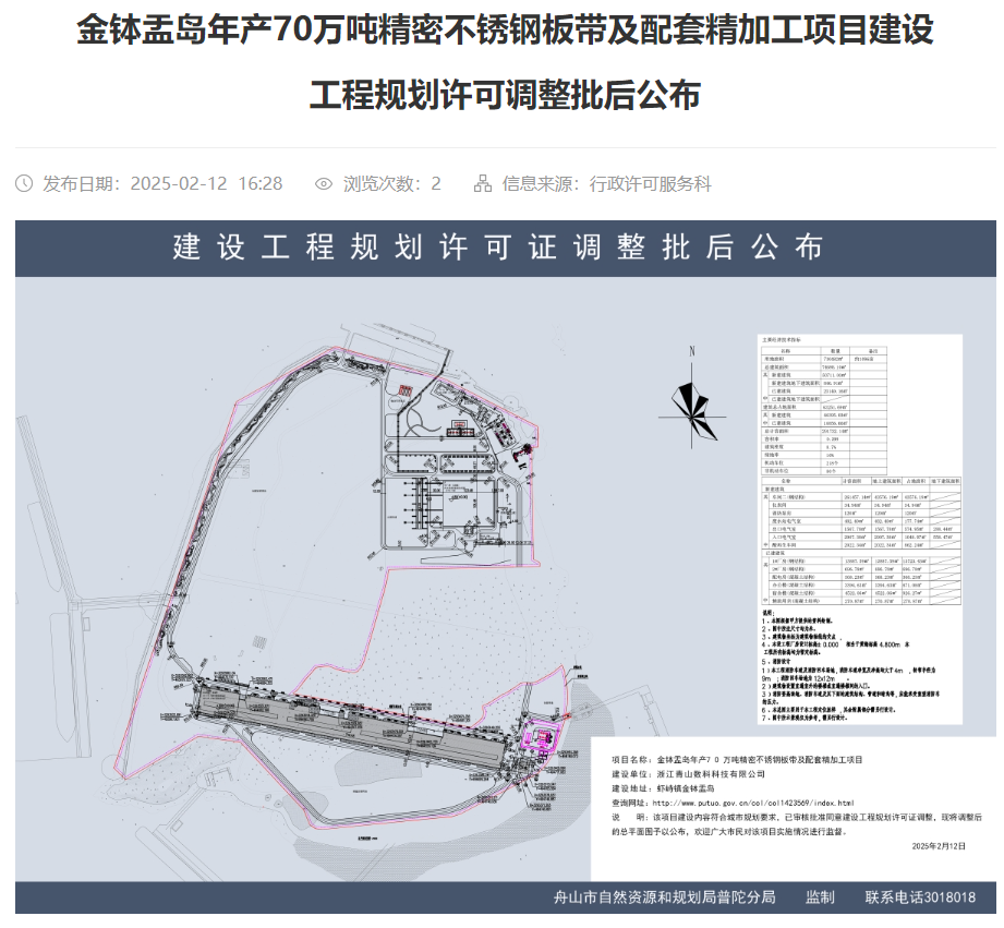 2025年2月12日,金缽盂島年產(chǎn)70萬噸精密不銹鋼板帶及配套精加工項目建設(shè)工程規(guī)劃許可調(diào)整批后公布。