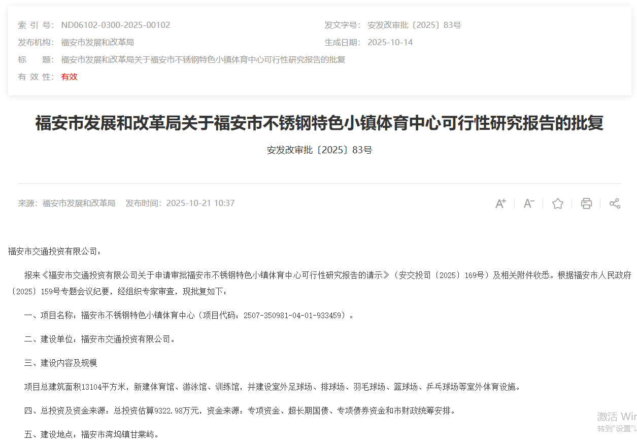 2025年10月14日,福安市發(fā)展和改革局就福安市不銹鋼特色小鎮(zhèn)體育中心可行性研究報告作出批復(fù)意見。
