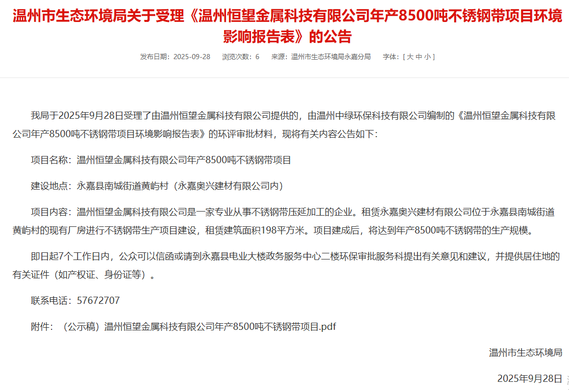 2025年9月28日,溫州市生態(tài)環(huán)境局受理溫州恒望金屬科技有限公司年產(chǎn)8500噸不銹鋼帶項目環(huán)境影響報告表并對外進(jìn)行公告,公告期:7個工作日。